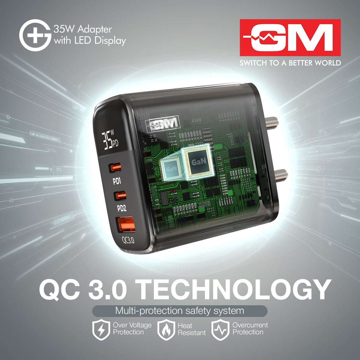 The GM G+ 35W Adapter is a compact, multi-port charging solution designed for everyday efficiency. With 35W power output, three charging ports, and a smart LED display, it lets you charge multiple devices while keeping real-time visibility of charging output. Lightweight, travel-friendly, and built for reliability, it’s a practical choice for modern devices.